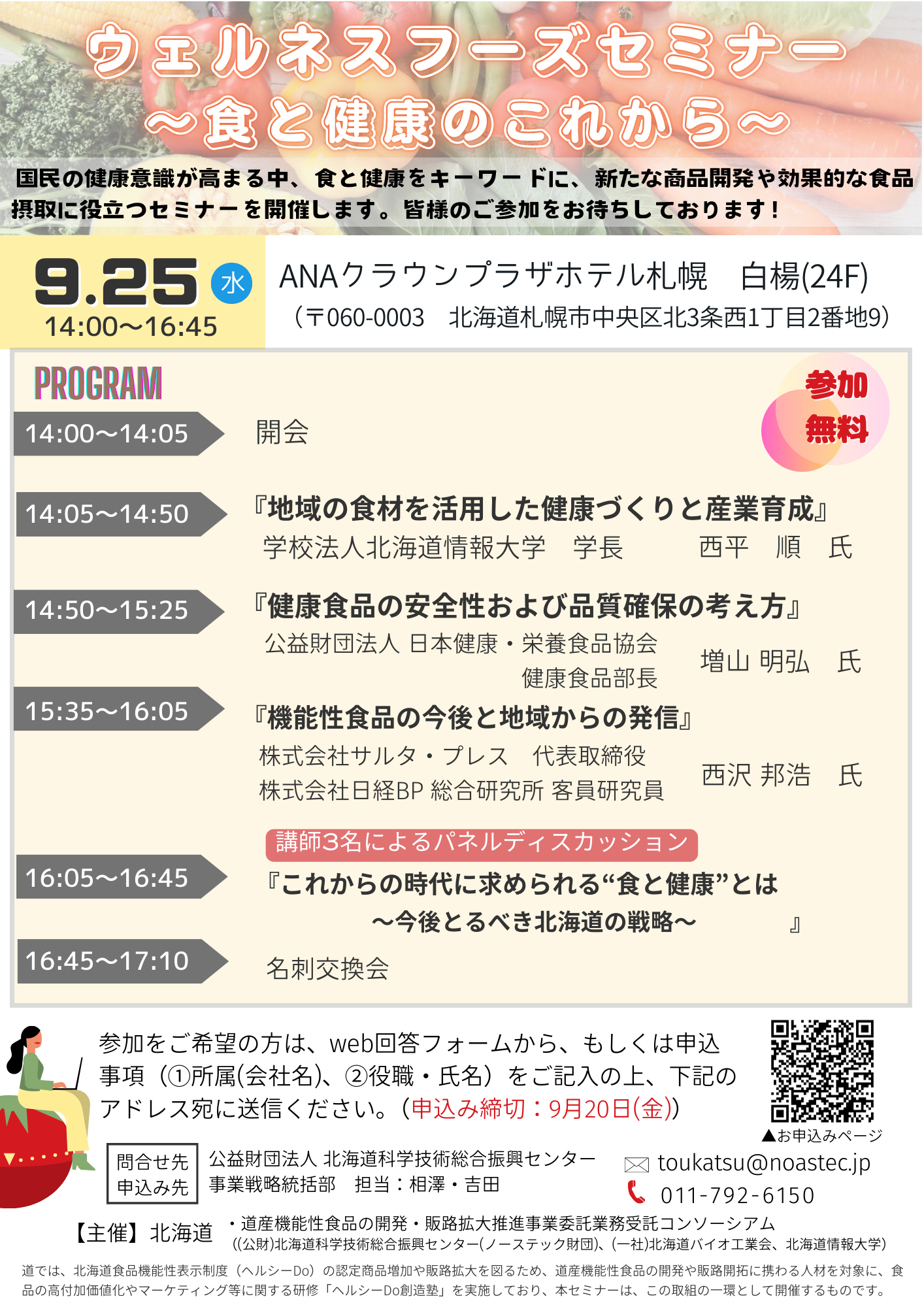 本セミナーでは、健康維持・増進に向けた道内の様々なプロジェクトや国内外の最新健康トレンド、健康食品の製造管理・品質確保に関する情報提供を行います。