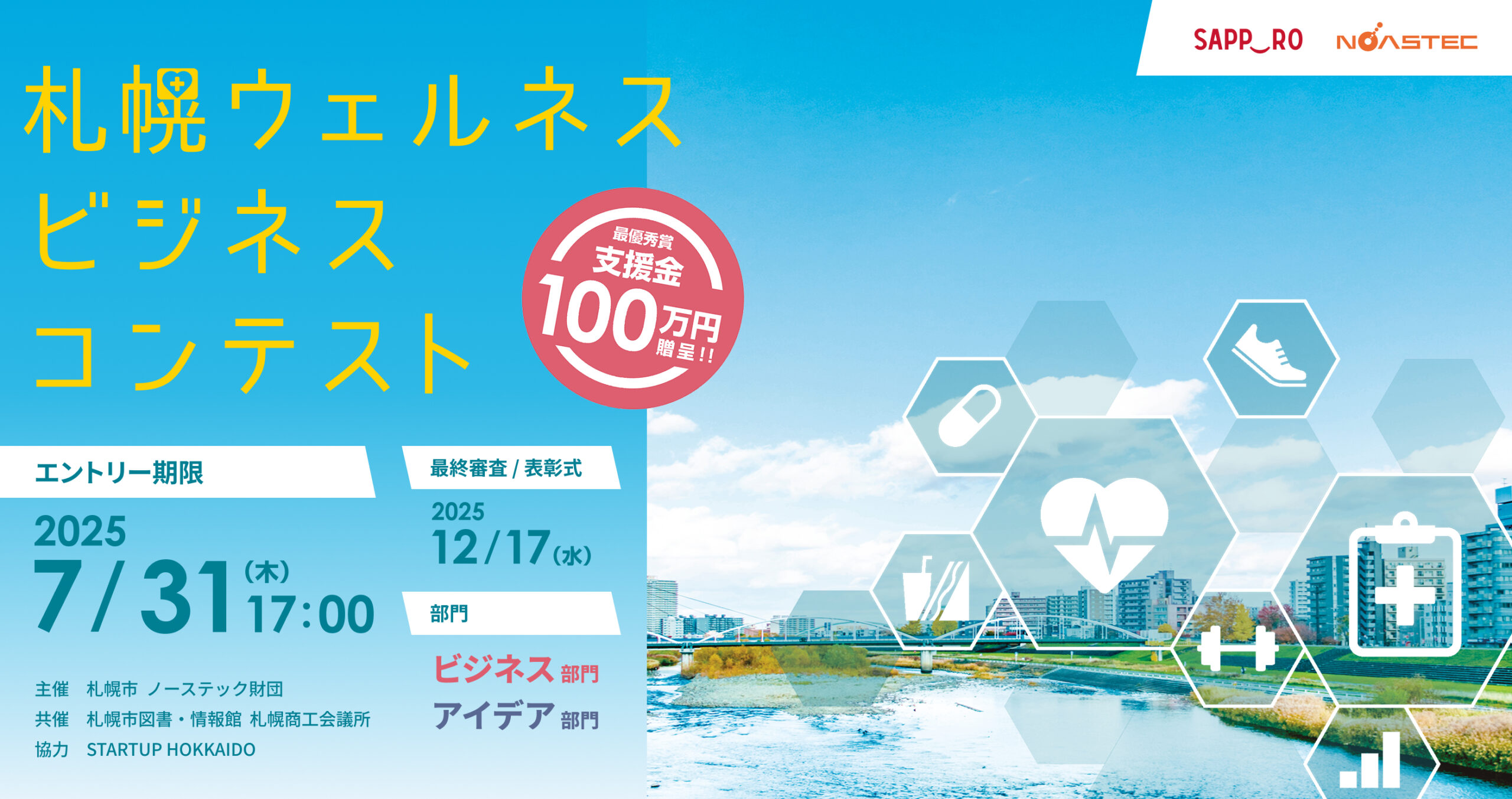 このたび、札幌市とノーステック財団は、市内発のウェルネスビジネスのさらなる拡大と、市民に広く寄与するウェルネスの取組の推進を目的に、今後の成長を目指すビジネスモデルと事業化に向けたアイデアを募集します。最優秀賞受賞者には、支援金の贈呈と地域のネットワーク等を駆使したハンズオン(伴走)支援等を行います。ぜひご応募ください!