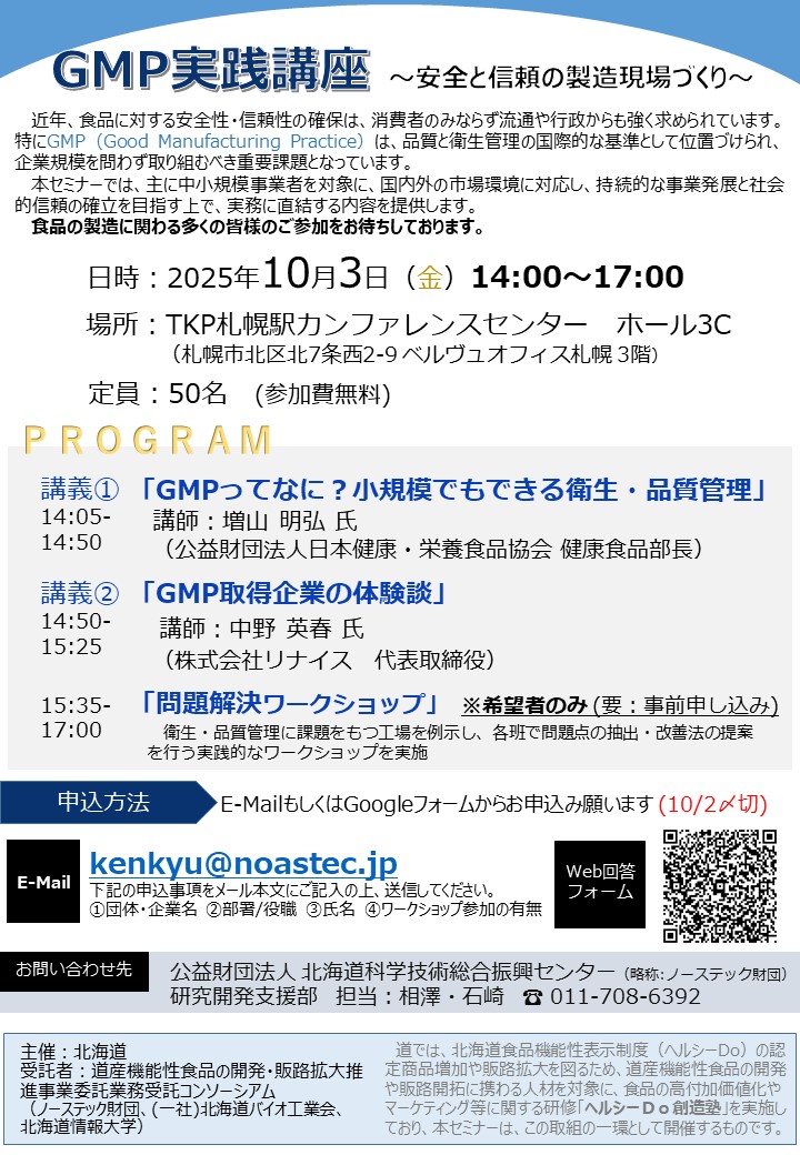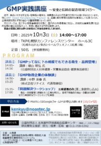 本セミナーでは、中小規模事業者を対象に品質・衛生管理に関する基本の考え方、実際にGMPを取得した道内企業の体験談、 さらには具体的な事例を取り上げた改善ワークショップを行います。