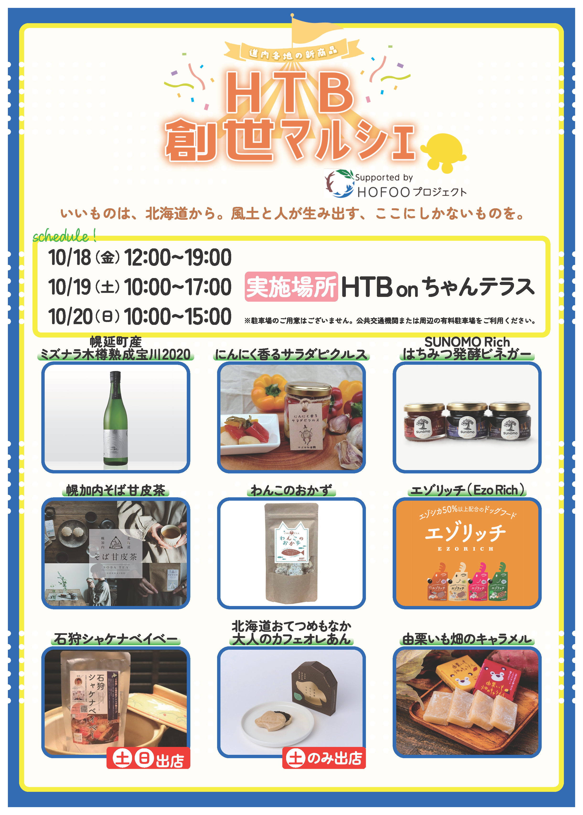 10月18日(金)から10月20日(日)までの3日間、「HTB創成マルシェ」に出展いたします。
