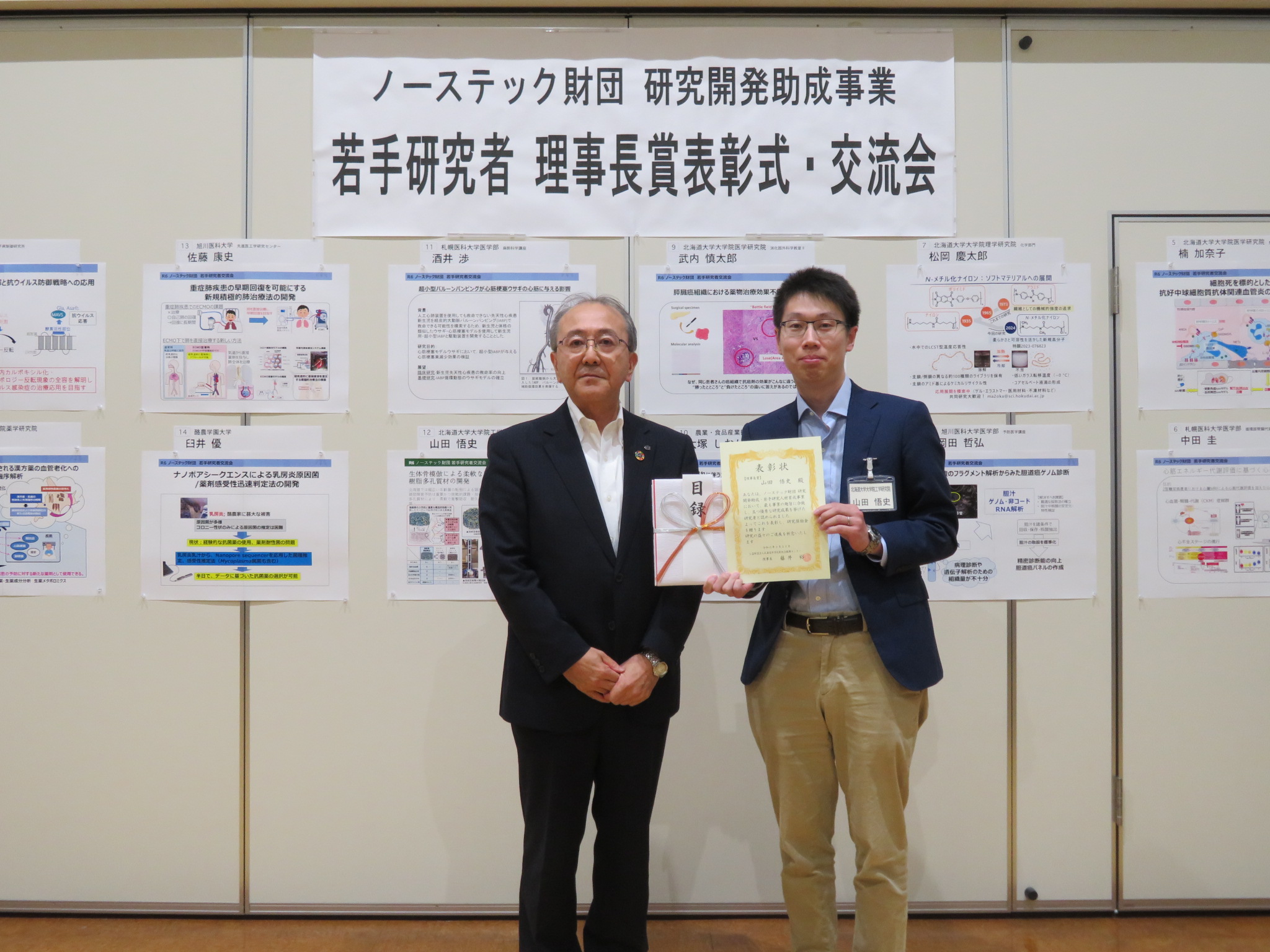 また、助成対象研究テーマの中から、北海道大学大学院工学研究院 助教 山田 悟史 氏の「生体骨模倣による柔軟な高エネルギ吸収性樹脂多孔質材の開発」に対し、第16回理事長賞を贈呈しております。
